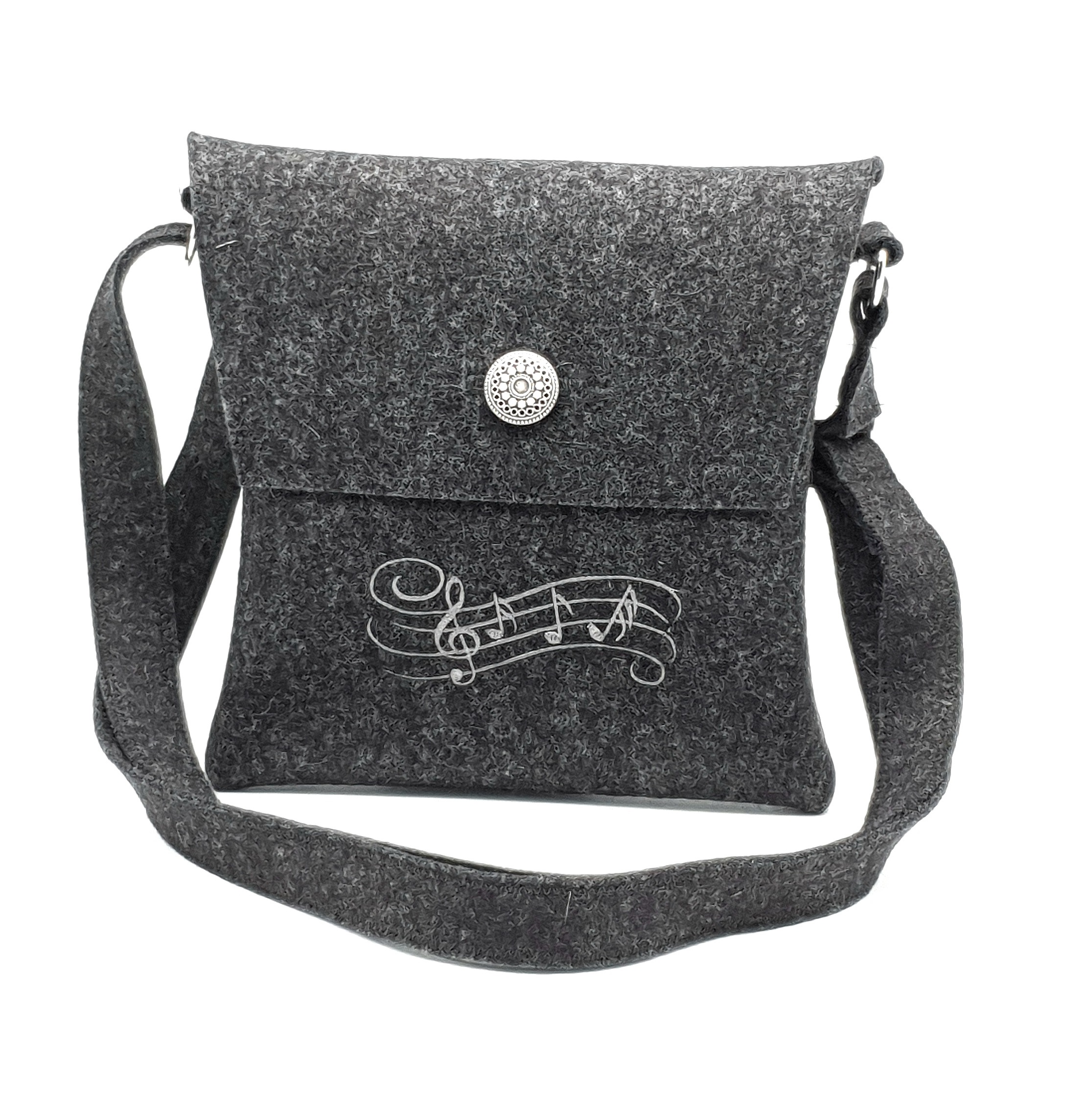 Trendige kleine Trachtentasche aus 100% Wollfilz Farbe anthrazit mit Knopfverschluß. Bestickt mit einem Notenmotiv. Mit einem verstellbarem Gurt zum umhängen. Gurtlänge maximal ca. 130 cm. Maße der Tasche ca. 22 cm hoch und 20 cm breit.