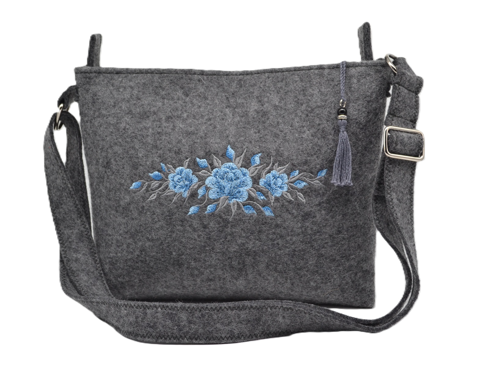Neue Filztasche in dkl.meliert mit Reißverschluß und einer Innentasche. Mit einem verstellbaren Gurt. Maße der Tasche ca. 22 cm hoch und 27 cm breit. Das Blumen-Stickmotiv in silber-grau und blau ist ein absoluter Hingucker!