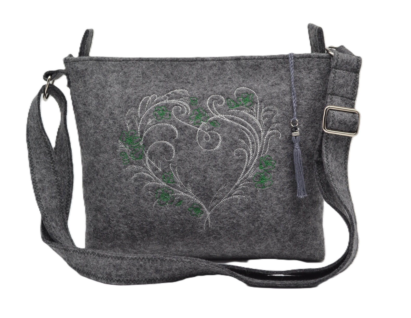 Neue Trachtentasche in dunkel-meliert mit einem gesticktem Herz mit grünen Blüten. Alle M Taschen haben einen verstellbaren Gurt. Somit kann die Tasche kurz oder lang um den Hals getragen werden. Außerdem haben alle M Taschen einen Reißverschluss sowie eine Innentasche. Die Taschen sind ca. 27 cm breit und ca. 22 cm hoch. Ein absoluter Hingucker nicht nur zur Tracht.