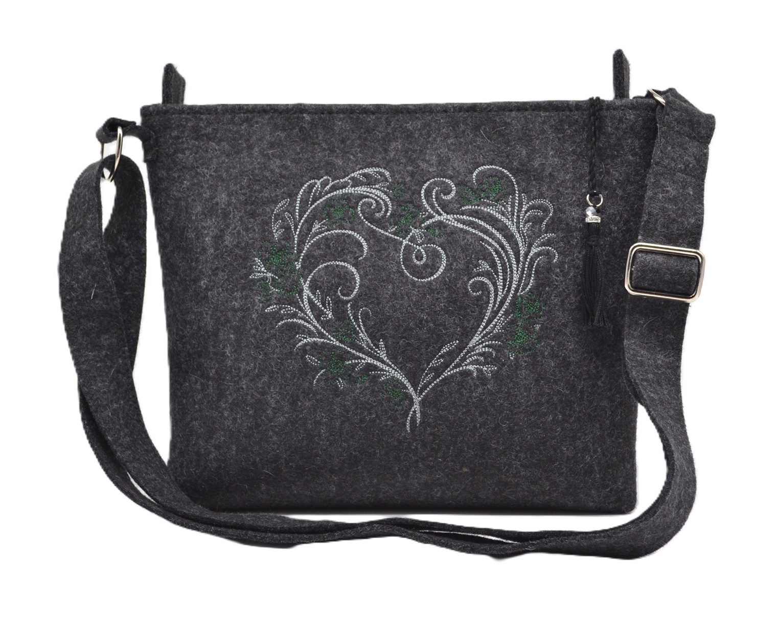 Neue Trachtentasche in anthrazit mit einem gesticktem Herz mit grünen Blüten. Alle M Taschen haben einen verstellbaren Gurt. Somit kann die Tasche kurz oder lang um den Hals getragen werden. Außerdem haben alle M Taschen einen Reißverschluss sowie eine Innentasche. Die Taschen sind ca. 27 cm breit und ca. 22 cm hoch. Ein absoluter Hingucker nicht nur zur Tracht.