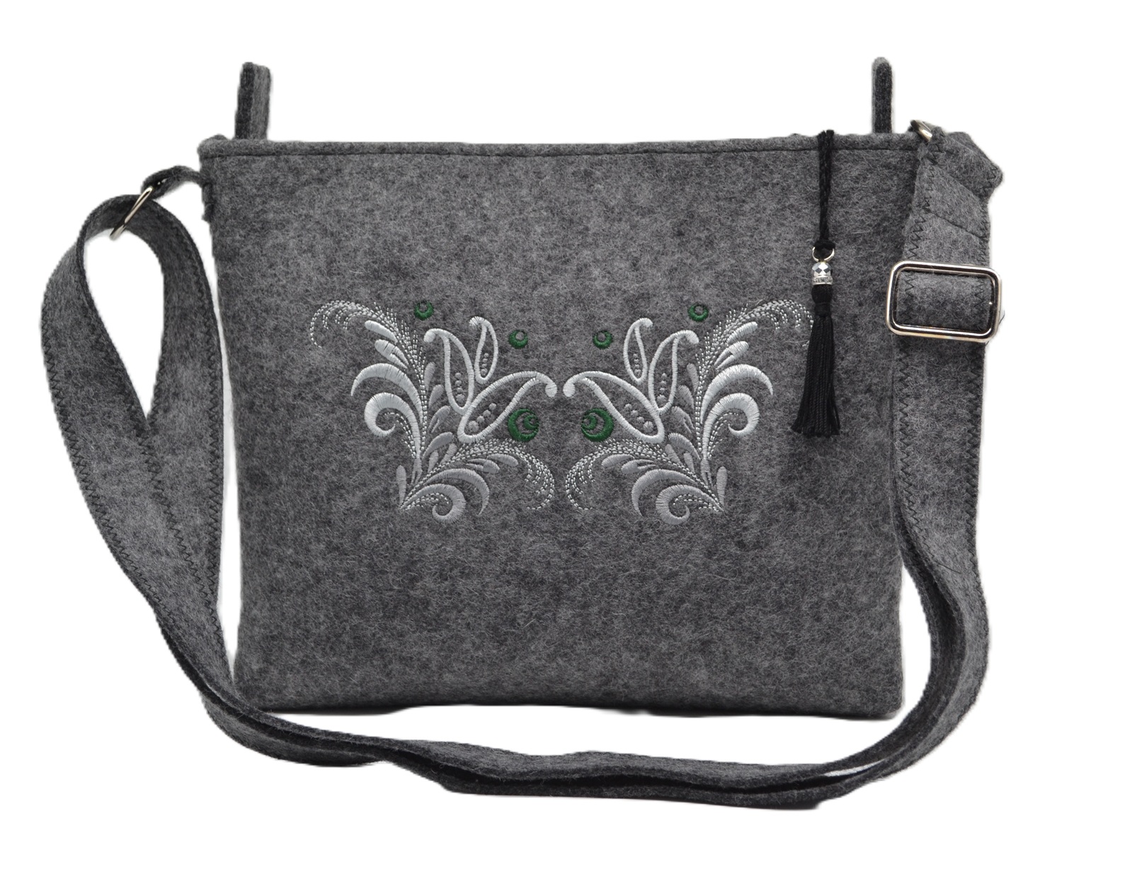 Wunderschöne Filztasche in dunkel-meliert bestickt mit einem Rankenmotiv in neutraler Farbe mit grünen Akzenten. Alle M Taschen haben einen verstellbaren Gurt. Somit kann die Tasche kurz oder lang um den Hals getragen werden. Außerdem haben alle M Taschen einen Reißverschluss sowie eine Innentasche. Die Taschen sind ca. 27 cm breit und ca. 22 cm hoch. Ein absoluter Hingucker.
