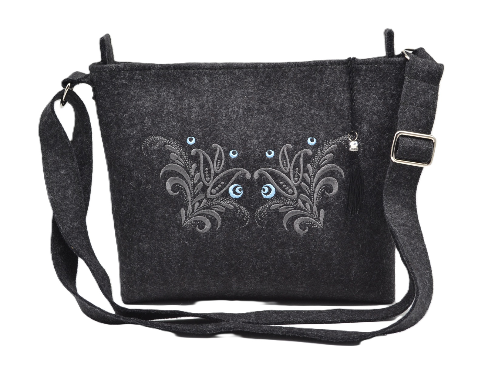 Wunderschöne Filztasche in anthrazit bestickt mit einem Rankenmotiv in neutraler Farbe mit hellblauen Akzenten. Alle M Taschen haben einen verstellbaren Gurt. Somit kann die Tasche kurz oder lang um den Hals getragen werden. Außerdem haben alle M Taschen einen Reißverschluss sowie eine Innentasche. Die Taschen sind ca. 27 cm breit und ca. 22 cm hoch. Ein absoluter Hingucker.