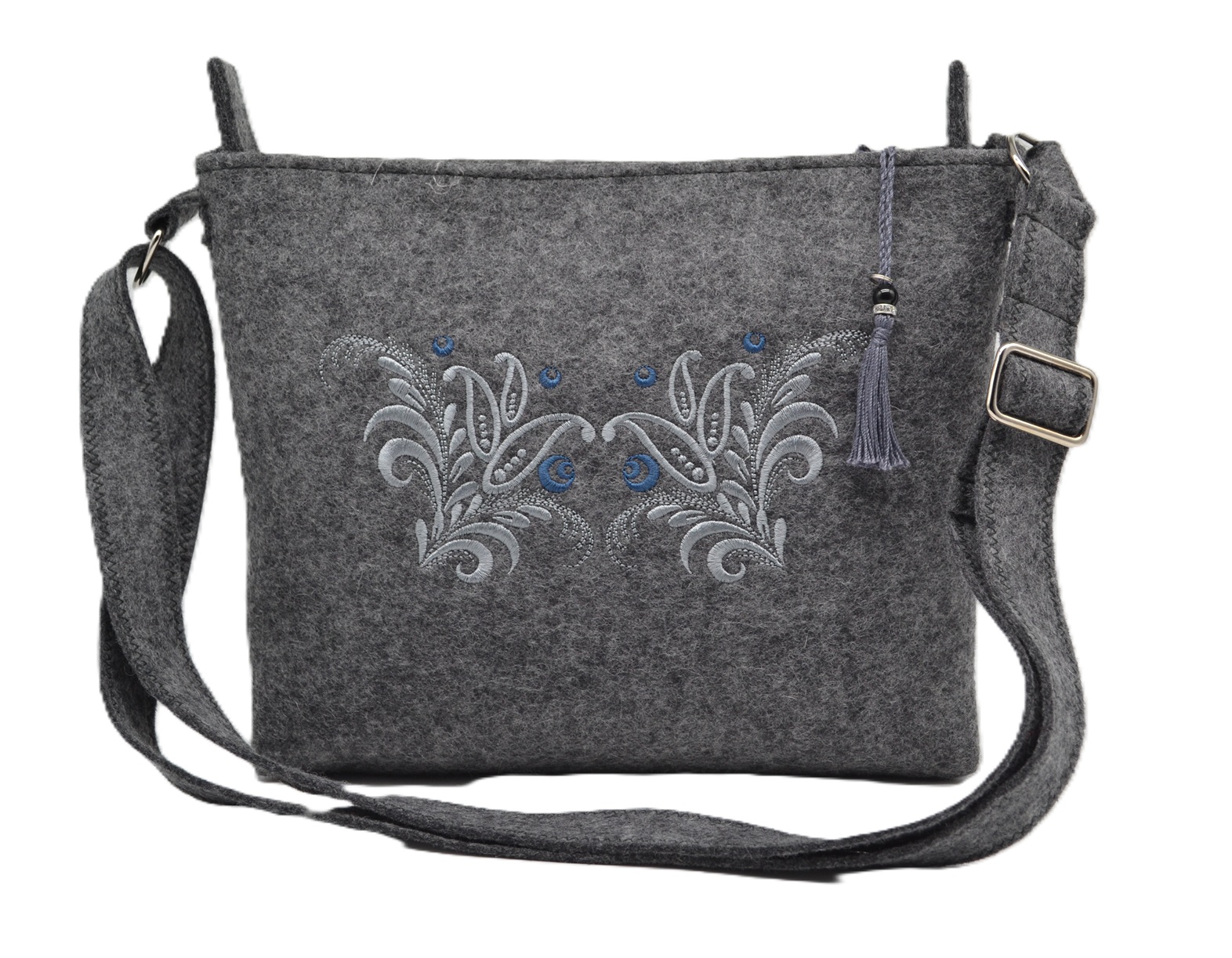 Neue Filztasche in dunkel-meliert, bestickt mit einem wunderschönen Stickmotiv in neutraler Farbe mit petrol-blauen Akzenten. Die Größe M hat einen verstellbaren Gurt. Somit kann die Tasche über dem Kopf, über der Schulter oder kurz in der Hand getragen werden. Die Taschen haben alle einen Reißverschluß mit selbst gemachten Bommel sowie eine Innentasche. Mit 27 cm Breite und ca. 22 cm Höhe bietet sie genügend Platz für alles Notwendige.