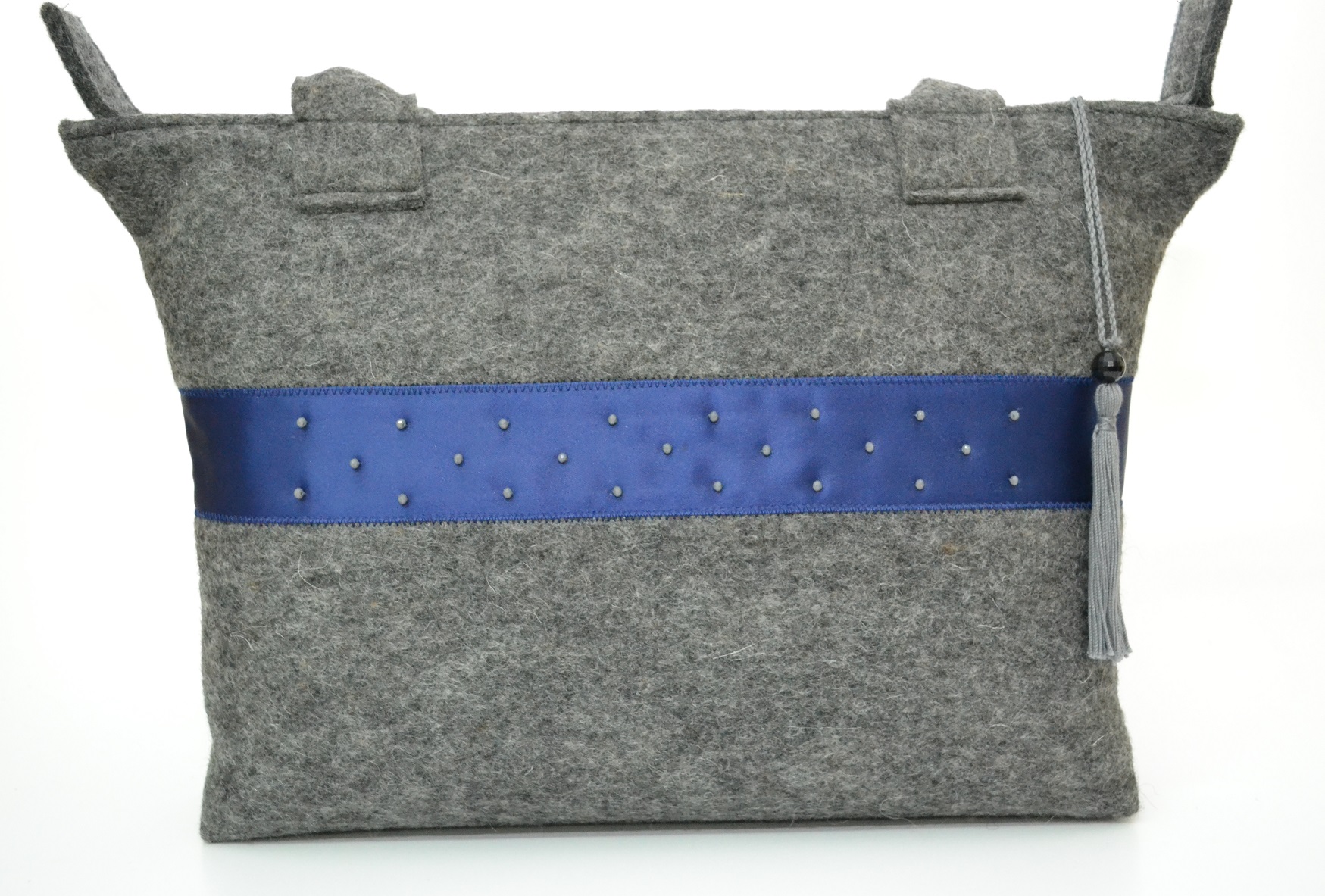 Trachtentasche aus 100 % Wollfilz dunkel-meliert mit dunkelblauer Borte.Die Borte ist noch zusätzich mit Perlen versehen. Die Tasche hat einen Reißverschluss und eine Innentasche. Mit 2 kurzen Gurten ca. 65 cm Länge. Maße der Tasche ca. 35 cm breit und 25 cm hoch. Ideal zum blauen Dirndl aber auch alltagstauglich zur Jeans.