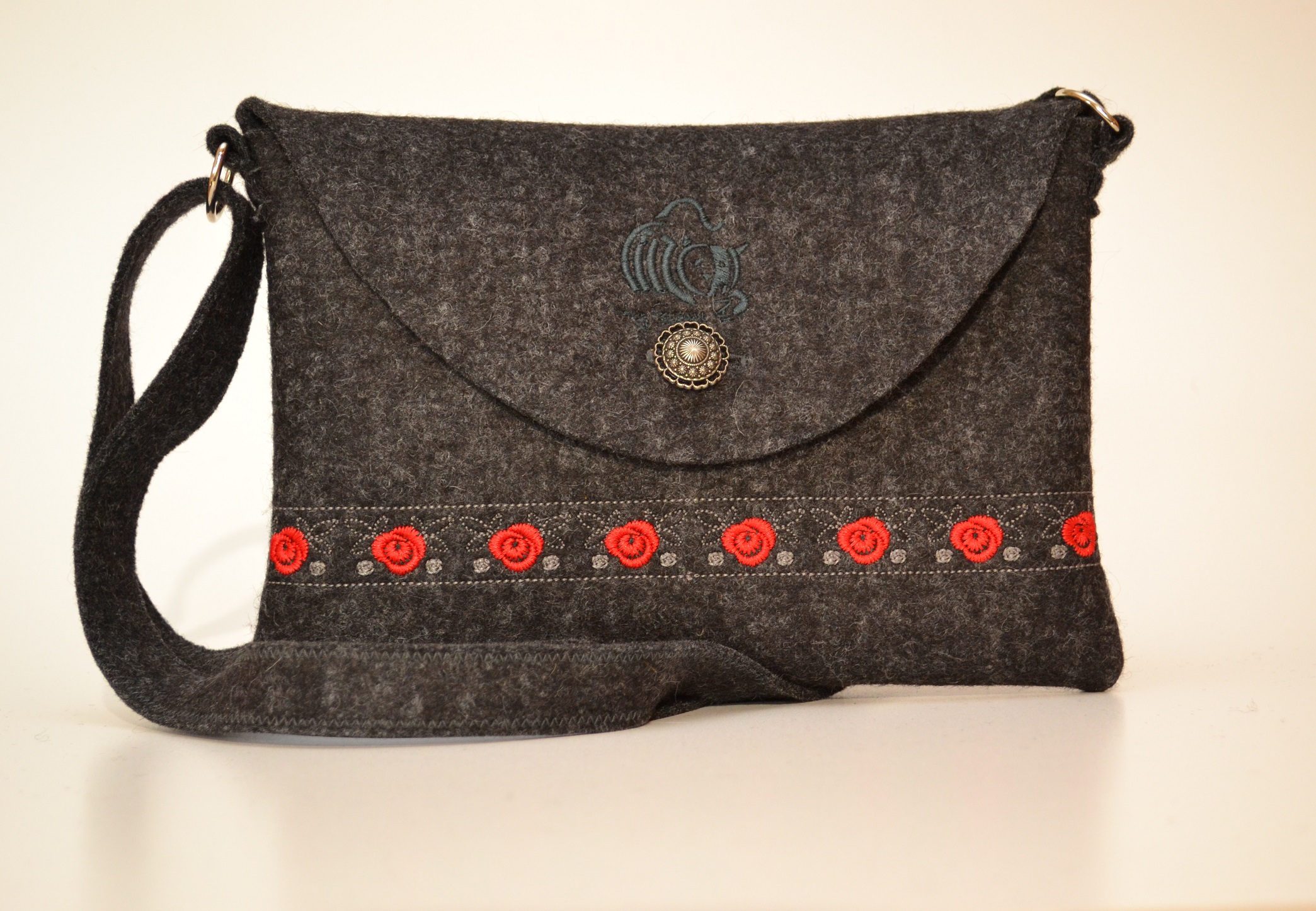Trendige kleine Trachtentasche mit gestickter Rosenborte Borte in rot. 100% Wollfilz Farbe anthrazit mit Knopfverschluß. Mit verstellbarem Gurt zum umhängen. Gurtlänge bis zu ca. 130 cm. Maße der Tasche ca. 18 cm hoch und 26 cm breit.
