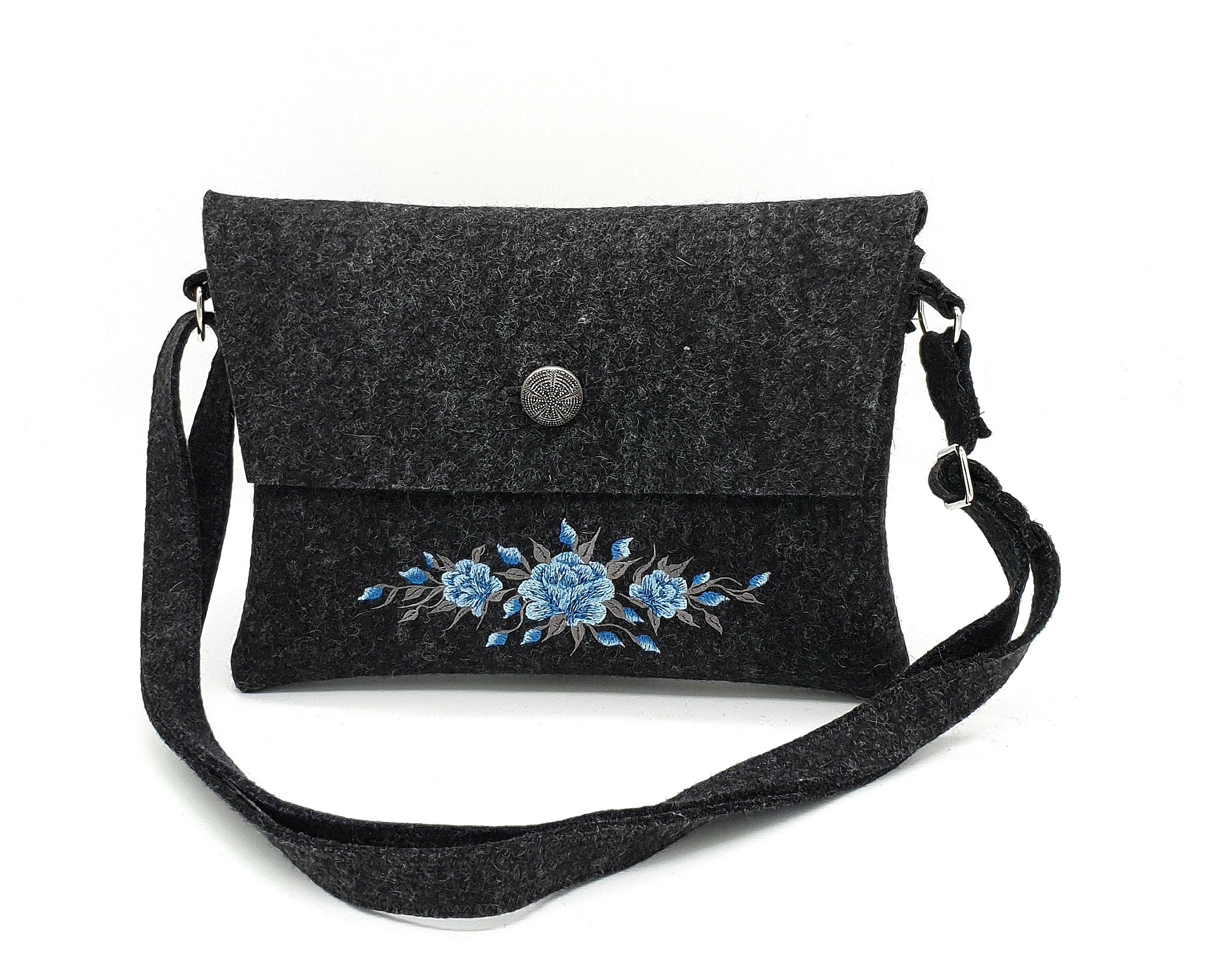 Trendige Trachtentasche aus 100% Wollfilz Farbe anthrazit mit Knopfverschluß. Bestickt mit einer schönen Blumenranke in blau Tönen. Mit einem Gurt zum umhängen. Gurtlänge ca. 130 cm. Maße der Tasche ca. 18 cm hoch und 26 cm breit.