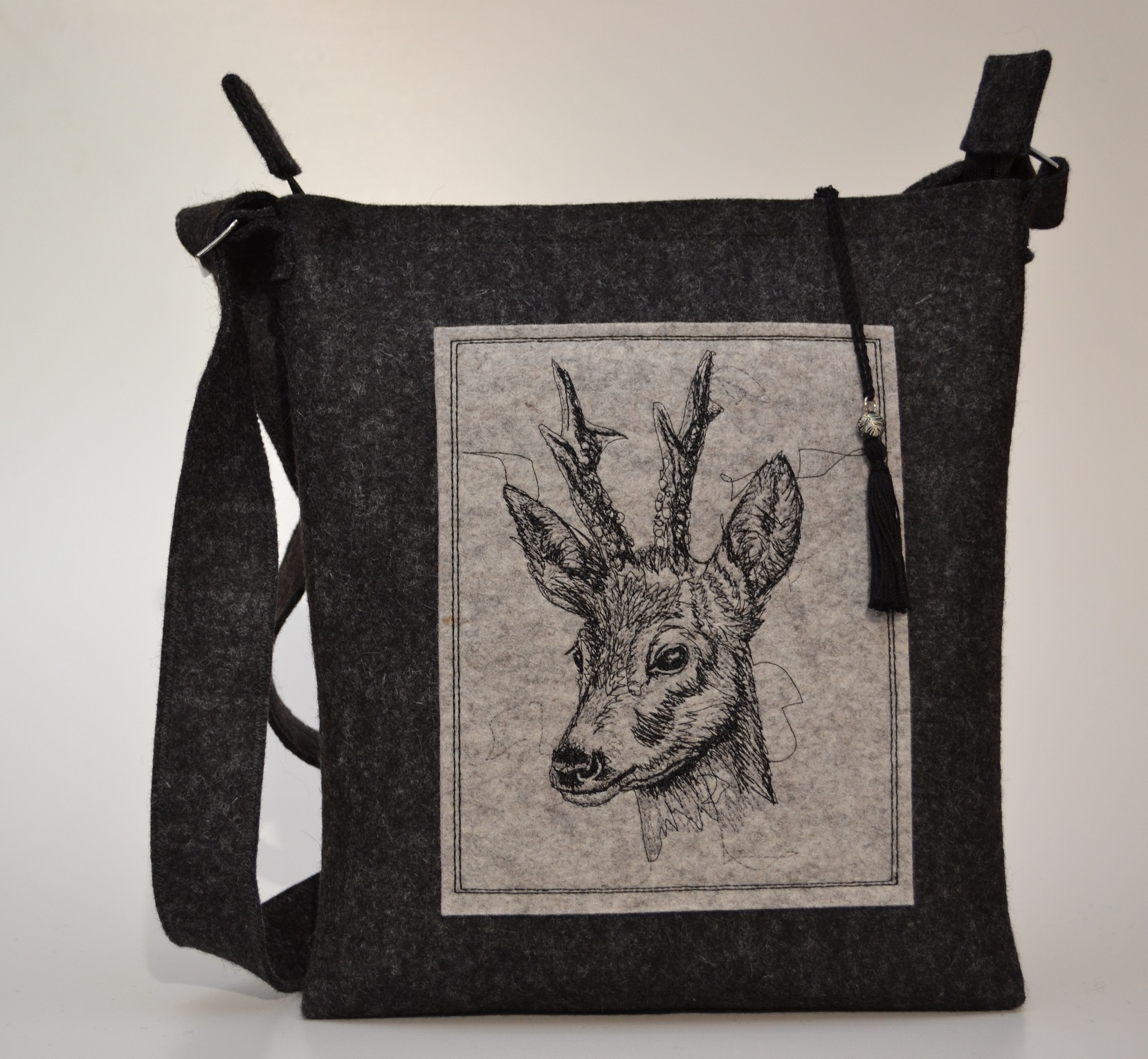 Wunderschöne große Tasche mit Reißverschluß und Innentasche in anthrazit. Die Tasche hat einen verstellbaren Gurt. Somit kann man die Tasche auch über dem Kopf tragen. Bestickt mit einem Rehbock auf einem hell-meliertem Filz. Das Modell XL ist bietet sehr viel Platz und ist nach dem Shopper unsere größte Tasche. Sie hat einen verstellbaren Gurt um die Tasche in der Hand, über der Schulter oder auch über dem Kopf zu tragen. Auch das Modell XL hat einen Reißverschluß und eine Innentasche. Die Tasche ist