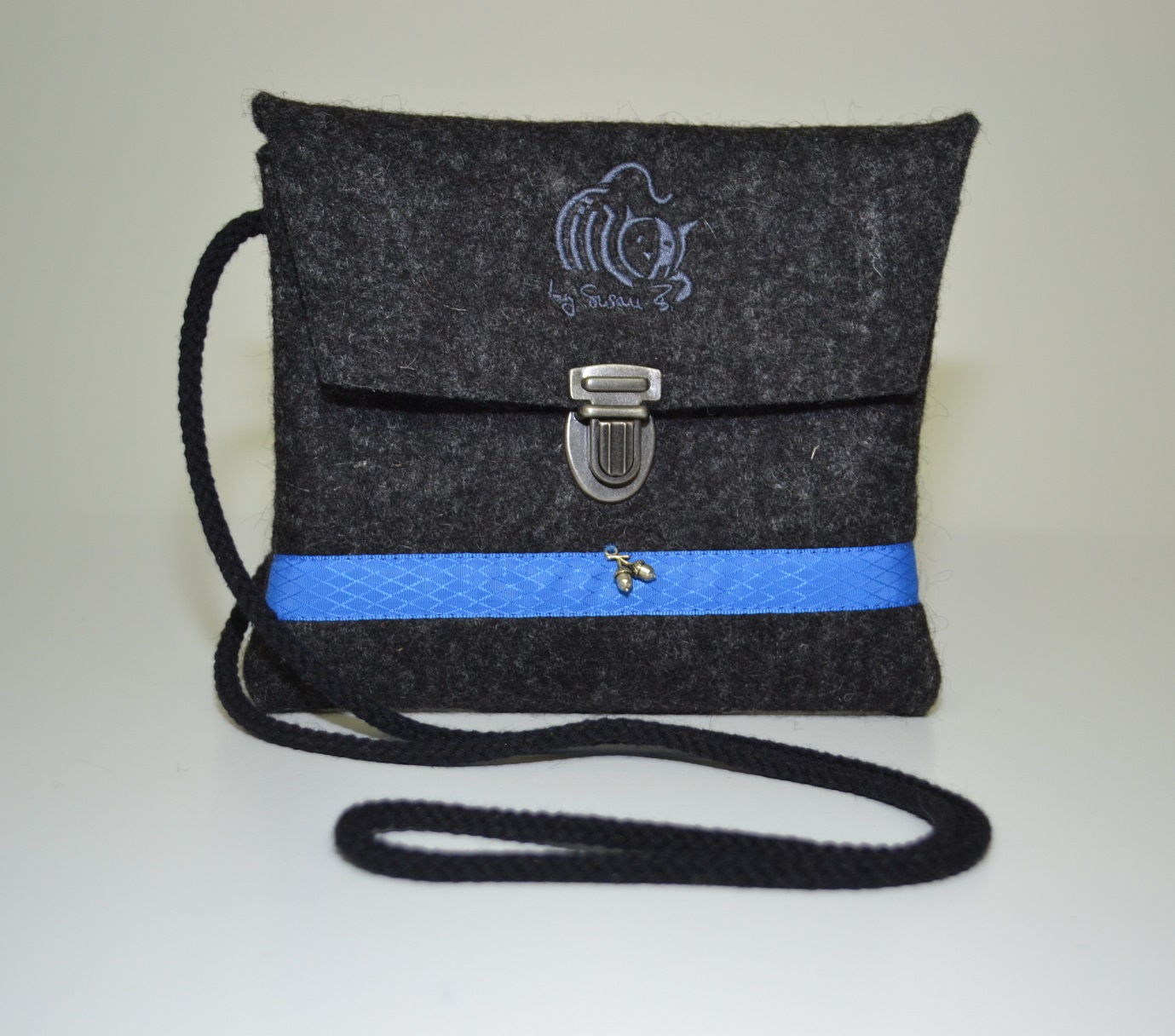Kleine Tasche für das Notwendigste!! Mit einer langen Kordel zum umhängen und Schlaufen auf der Rückseite zum befestigen an der Schürze wenn es mal etwas voller wird. Mit blauer Borte und kleinem Eichel Anhänger. Das Mappenschloss ist in altsilber Optik. Die Maße der Tasche sind ca. 17 cm breit und 15 cm hoch