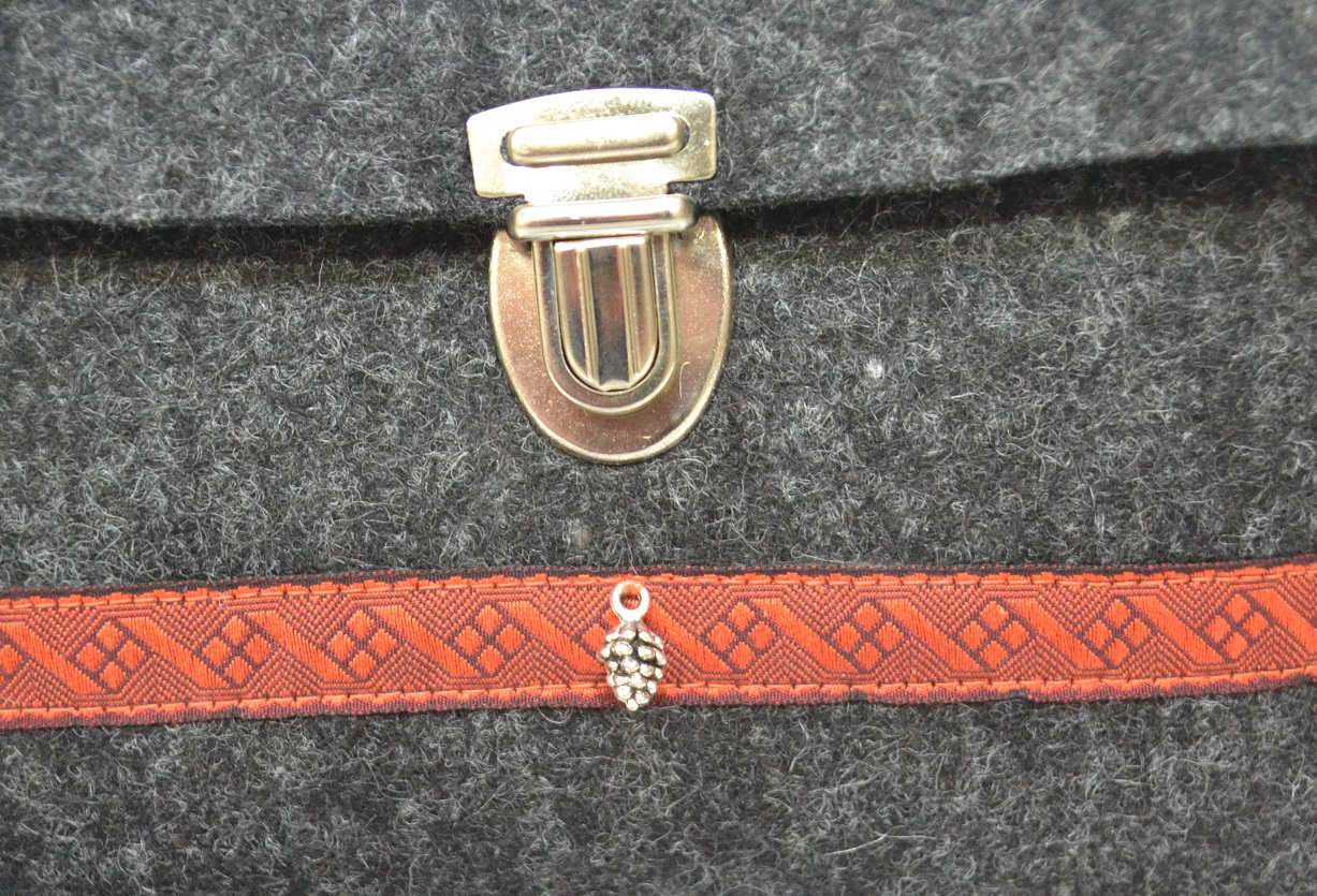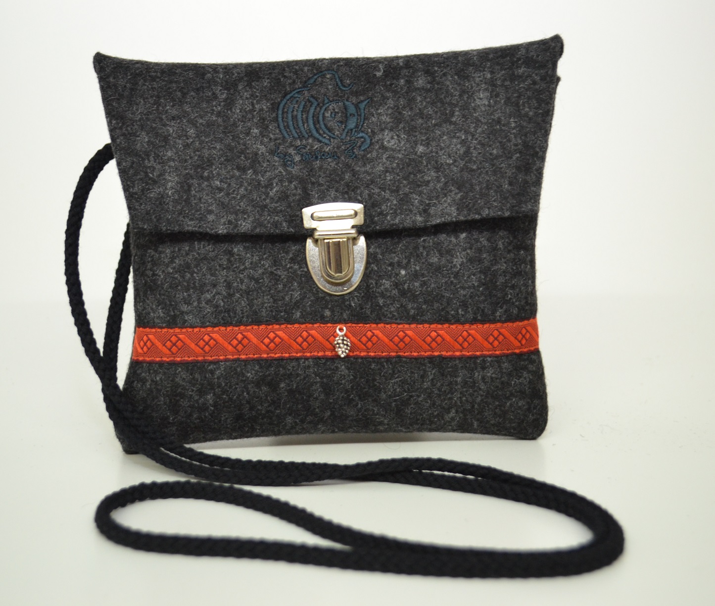 Kleine Tasche für das Notwendigste!! Mit einer langen Kordel zum umhängen und Schlaufen auf der Rückseite zum befestigen an der Schürze wenn es mal etwas voller wird. Mit roter Borte und kleinem Tannenzapfen Anhänger. Das Mappenschloss ist in silber Optik. Die Maße der Tasche sind ca. 17 cm breit und 15 cm hoch