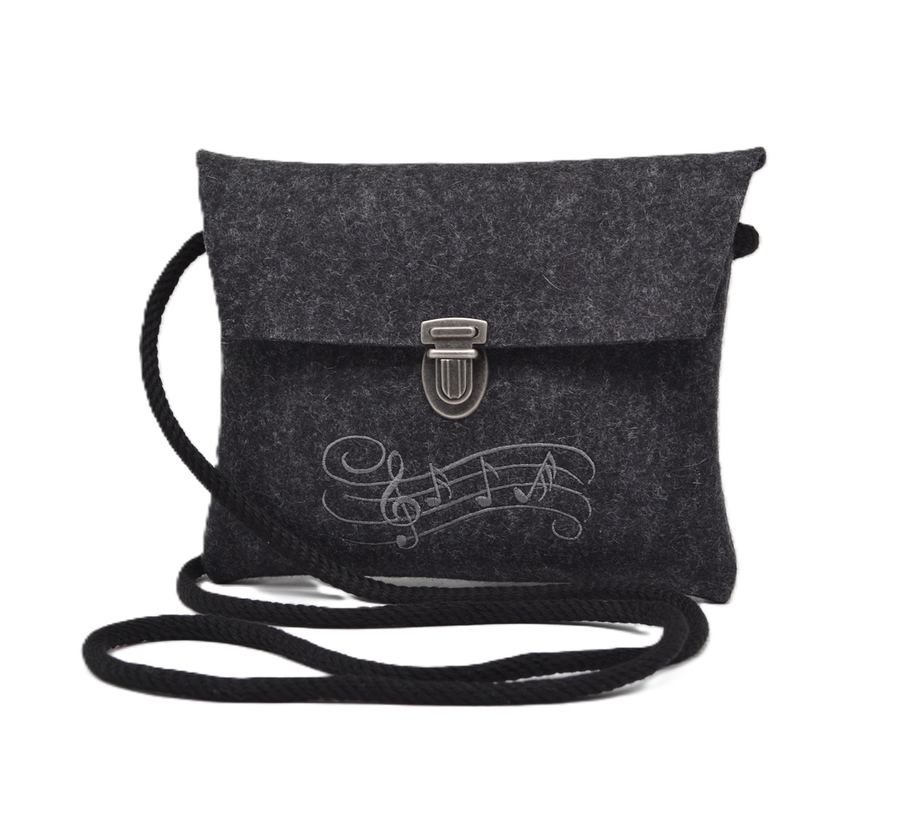 Neue kleine Schürzentasche in anthrazit mit einer langen Kordel zum umhängen und 2 Schlaufen auf der Rückseite zur Befestigung an der Schürze. Die Tasche hat ein Mappenschloß in altsilber-Optik und ist bestickt mit einem Notenmotiv in silber-grau. Passt auch zur Jeans oder zum Kostüm. Die Maße der Tasche sind ca 18 cm breit und 15 cm hoch und bietet somit Platz für das Notwendigste wie Börse, Handy Schlüssel usw....