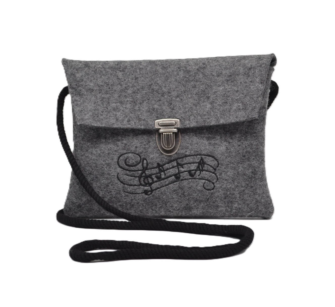 Neue kleine Schürzentasche in dunkel-meliert mit einer langen Kordel zum umhängen und 2 Schlaufen auf der Rückseite zur Befestigung an der Schürze. Die Tasche hat ein Mappenschloß in altsilber-Optik und ist bestickt mit einem Notenmotiv in schwarz. Passt auch zur Jeans oder zum Kostüm. Die Maße der Tasche sind ca 18 cm breit und 15 cm hoch und bietet somit Platz für das Notwendigste wie Börse, Handy Schlüssel usw....