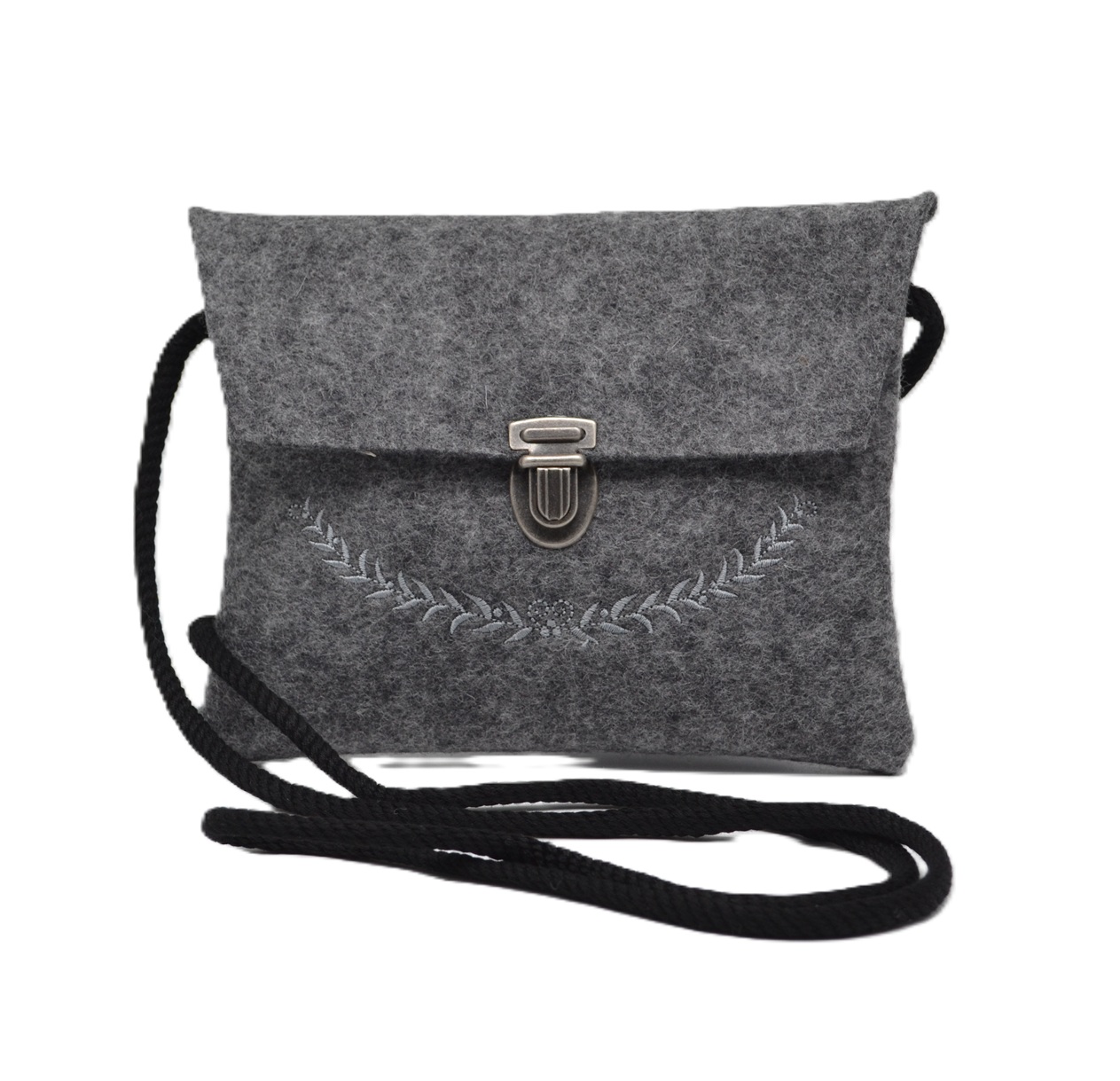 Wunderschöne kleine Schürzentasche mit gestickter Ranke in hellem silber. Die Tasche hat eine lange Kordel (ca.130 cm) zum umhängen und zusätzlich 2 Schlaufen auf der Rückseite zur Befestigung an der Schürze. Mit einem Mappenschloss in silber Optik. Sie bietet Platz für das Notwendigste wie Handy, Börse, Schlüssel usw..... Die Maße der Tasche sind ca. 19 cm breit und 17 cm hoch.