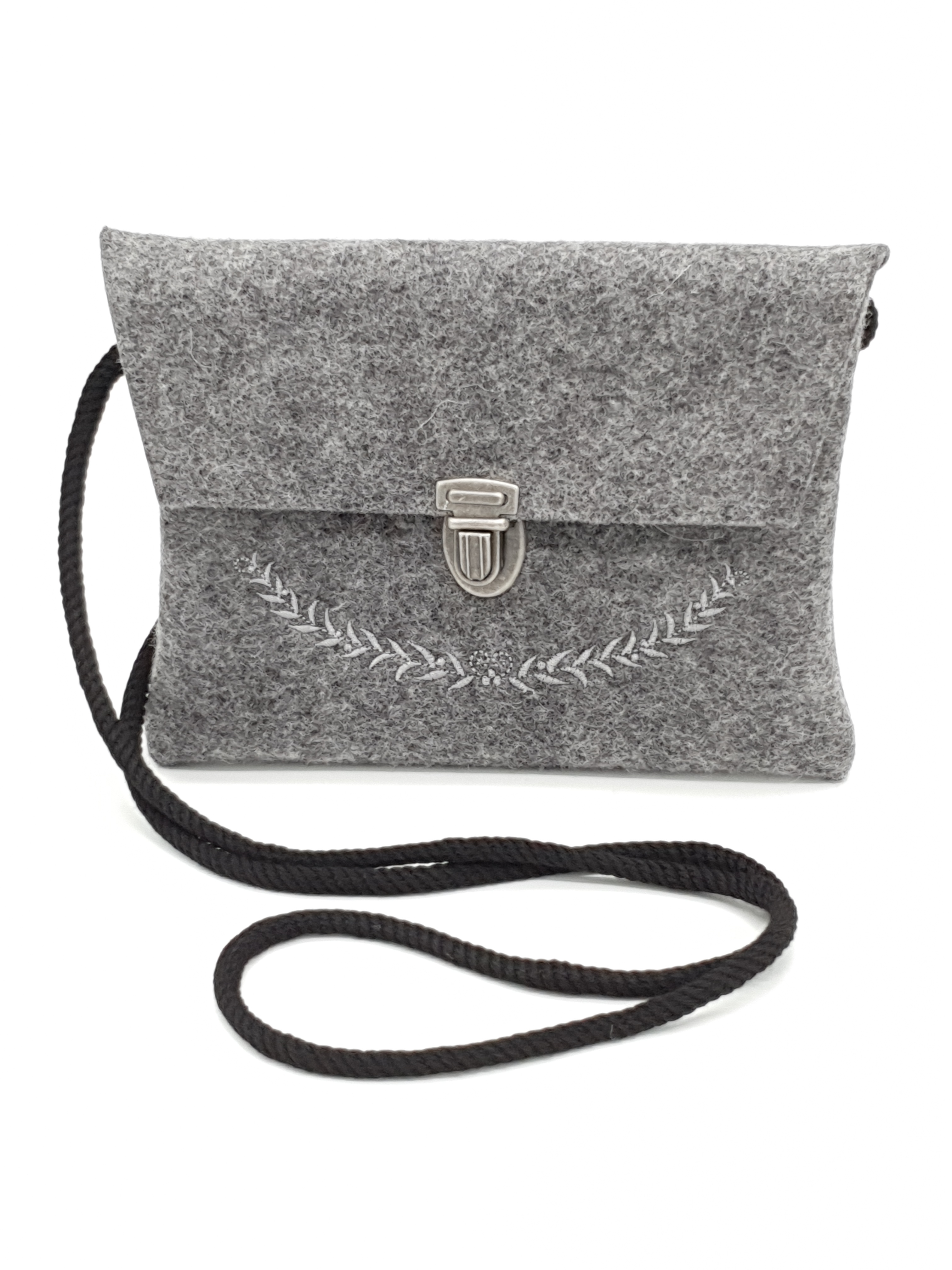 Wunderschöne kleine Schürzentasche mit gestickter Ranke und in Neutraler Farbe. Die Tasche hat eine lange Kordel (ca.130 cm) zum umhängen und zusätzlich 2 Schlaufen auf der Rückseite zur Befestigung an der Schürze. Mit einem Mappenschloss in silber Optik. Sie bietet Platz für das Notwendigste wie Handy, Börse, Schlüssel usw..... Die Maße der Tasche sind ca. 18 cm breit und 15 cm hoch.