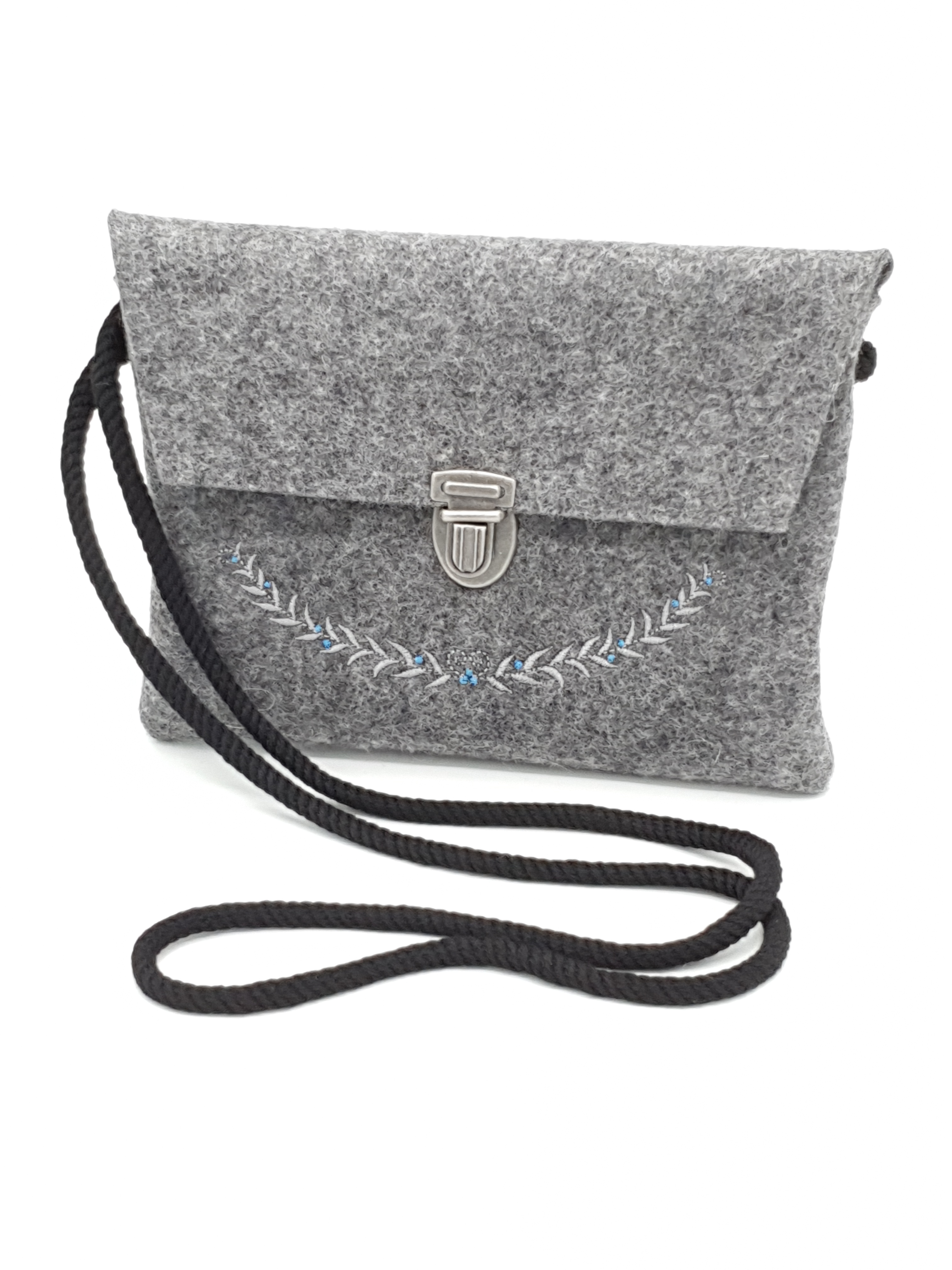 Kleine Tasche mit schöner gestickter Ranke mit blauen Punkten. Passt zum Dirnd´l aber auch zur Jeans oder zum Rock. Die Tasche hat eine lange Kordel (ca. 130 cm) zum umhängen aber auch 2 Schlaufen auf der Rückseite zum befestigen an der Schürze. Das Mappenschloss ist in Silber-Optik. Sie bietet Platz für das Notwendigste wie Handy, Geldbörse usw...., Die Maße der Tasche sind ca. 18 cm breit und 15 cm hoch.